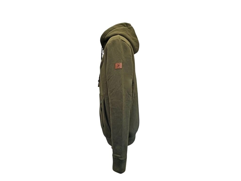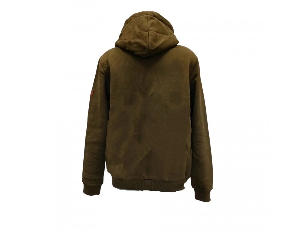 De hoodie is voorzien van een capuchon en opdruk van hoogwaardige kwaliteit (60% katoen / 40% polyester). De trui heeft een buidelzak aan de voorkant en kan bij de hals worden open geritst – ideaal voor wie een bril of pet draagt en deze niet steeds wil afzetten. De opdruk is subtiel en aangebracht met zeefdruk, waardoor hij bestand is tegen herhaald en frequent wassen. De binnenkant is opgeruwd, wat zorgt voor extra warmte bij koud weer. De kleur is groen, met een zwarte binnenkant van de capuchon. Op de voorzak bevindt zich nog een extra zak met ritssluiting (handig voor documenten of andere belangrijke spullen). Alle ritsen zijn van hoge kwaliteit, merk YKK. Een extra detail: duimgaten in de mouwboorden (de mouwen kunnen deels over de hand worden getrokken).
