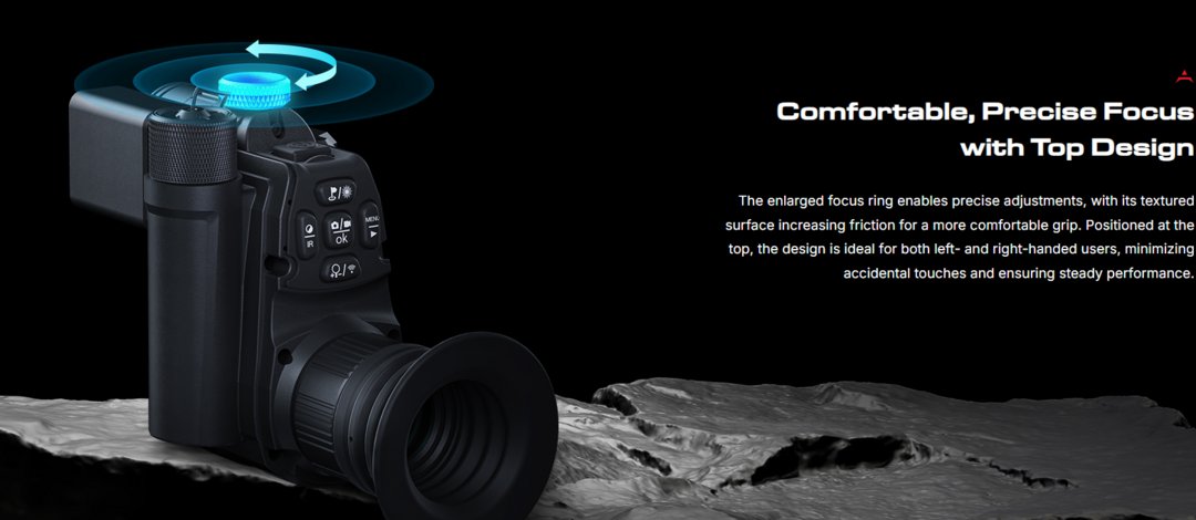 De vergrote scherpstelring maakt precieze aanpassingen mogelijk, terwijl het getextureerde oppervlak extra grip biedt. De bovenste positie is ideaal voor zowel links- als rechtshandige gebruikers en voorkomt onbedoelde aanrakingen voor een stabiele bediening.