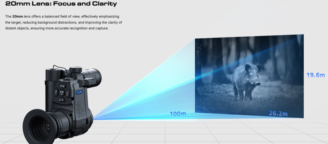 De 20mm lens biedt een uitgebalanceerd gezichtsveld, legt de nadruk op het doelwit, vermindert achtergrondafleiding en verbetert de helderheid van verre objecten – voor nauwkeurigere herkenning en scherpere beelden.