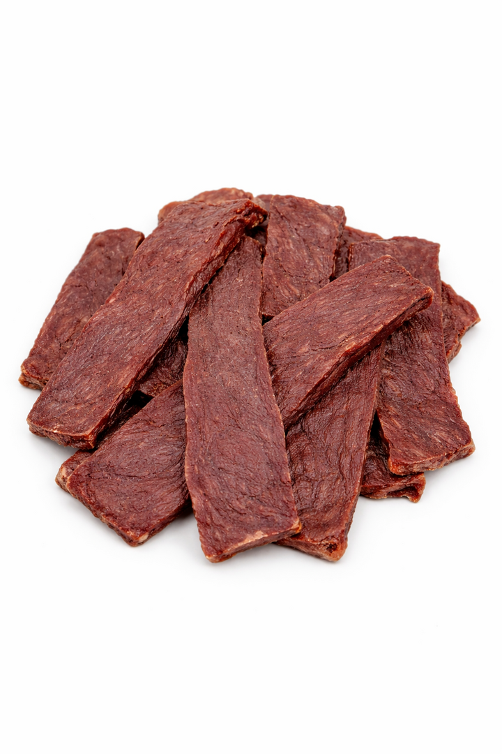 Natuurlijke Duck Jerky van 100% eendenvlees, zonder toevoegingen. Stevig, makkelijk te breken en verpakt in een afsluitbare zak. Productnummer: Waidmann316