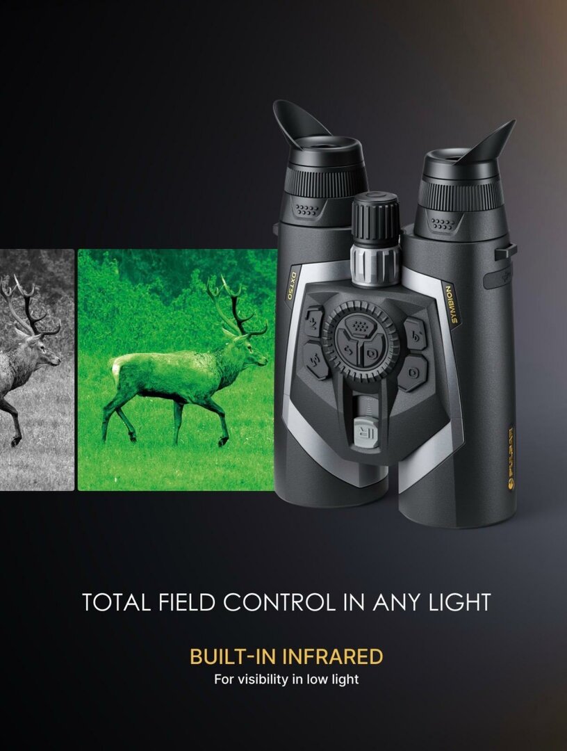 Premium multispectrale verrekijker met warmtebeeld, nachtzicht en full-color dagbeeld, inclusief geïntegreerde laserafstandsmeter. Dankzij het brede gezichtsveld is dit apparaat ideaal voor het afzoeken van bossen en gemengd terrein, met maximale beelddetail en snelle detectie bij daglicht, in het donker of in de schemering.