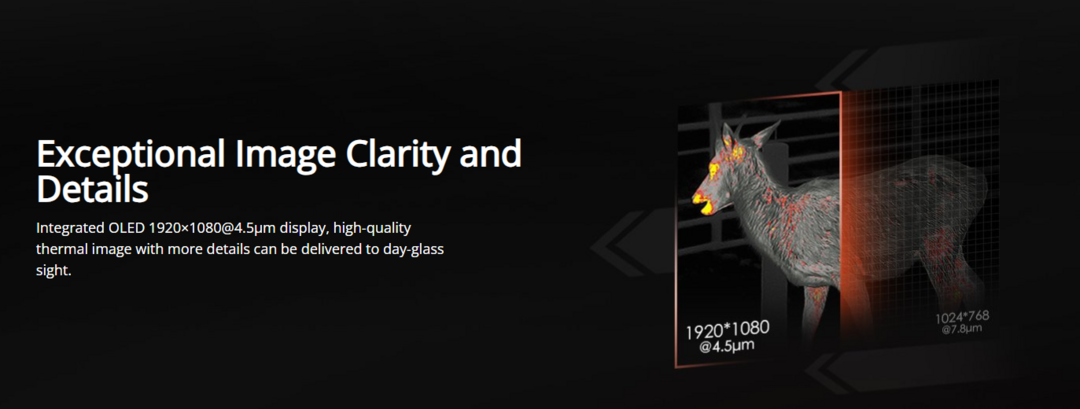 Het geïntegreerde OLED-display (1920×1080@4.5μm) levert een thermisch beeld van hoge kwaliteit met meer details, dat direct zichtbaar is door een dagkijker.