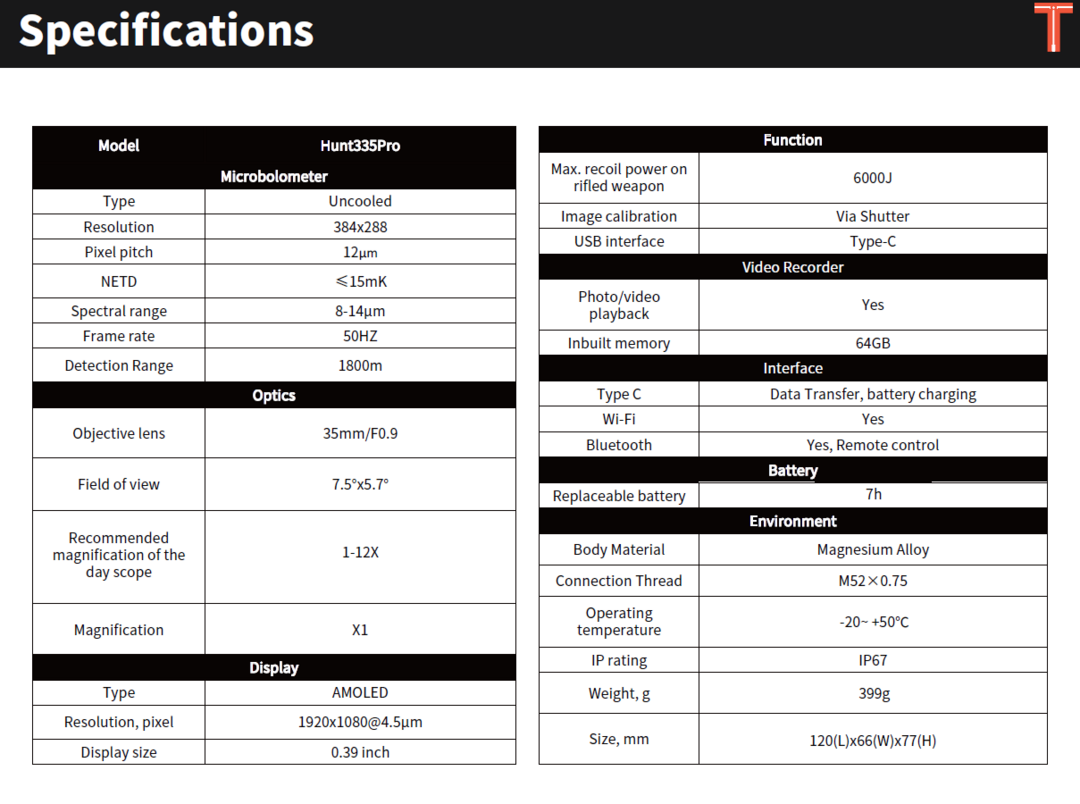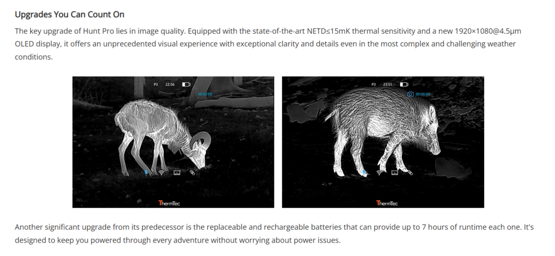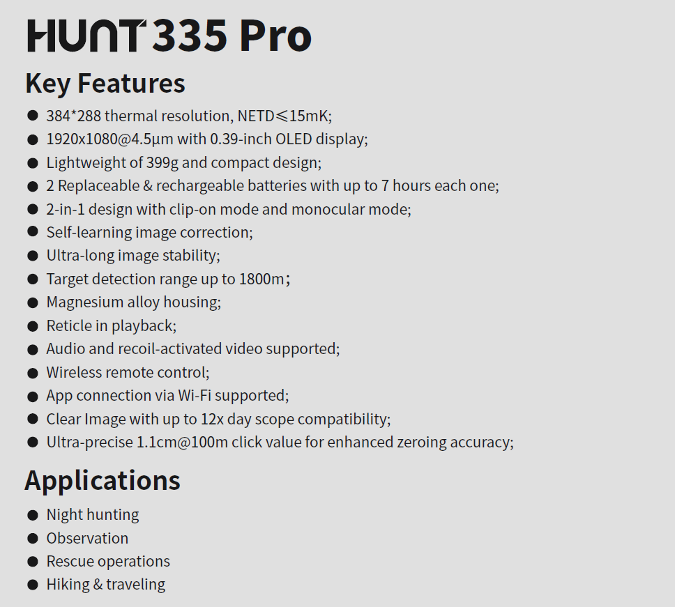 De ThermTec Hunt 335 Pro herdefinieert betaalbaarheid zonder in te boeten op prestaties. De 384×288-sensor met NETD ≤15mK levert betrouwbare thermische helderheid met een detectiebereik tot 1800 m dankzij de 35 mm-lens. Het 0,39-inch AMOLED-display (1920×1080@4.5μm) biedt vloeiende en gedetailleerde beelden. Betaalbaar maar robuust – met een batterijduur van 7 uur en vervangbare, oplaadbare accu’s die eenvoudig te wisselen zijn. Perfect voor jagers die op zoek zijn naar een kostenefficiënte thermische upgrade.