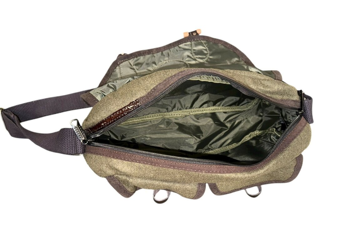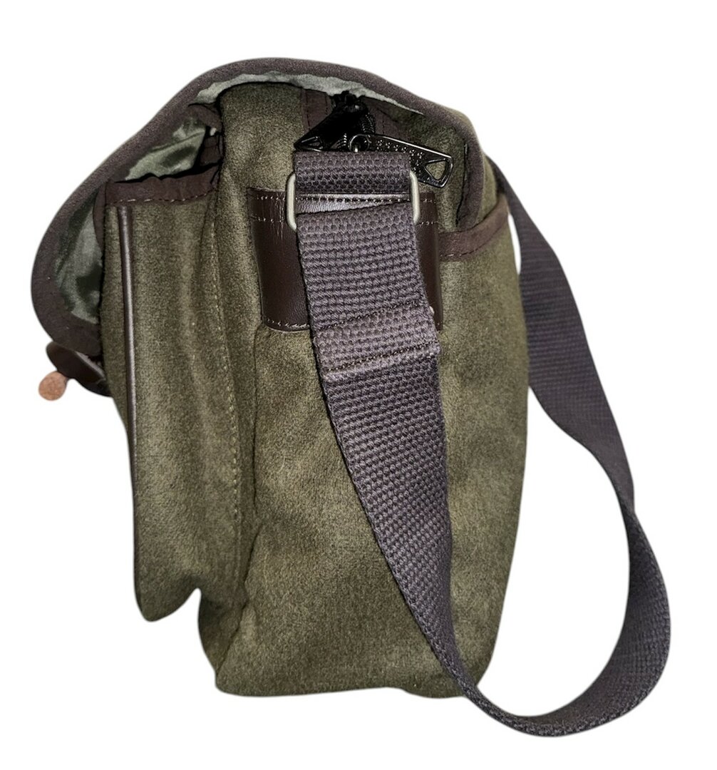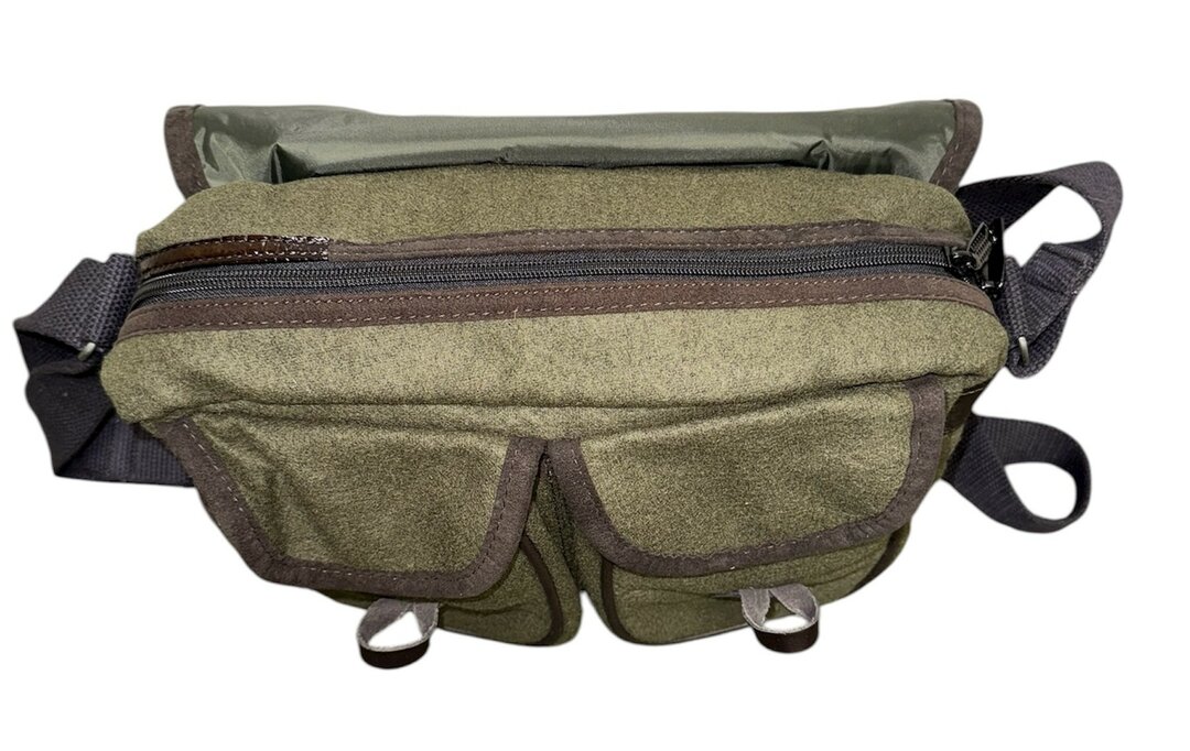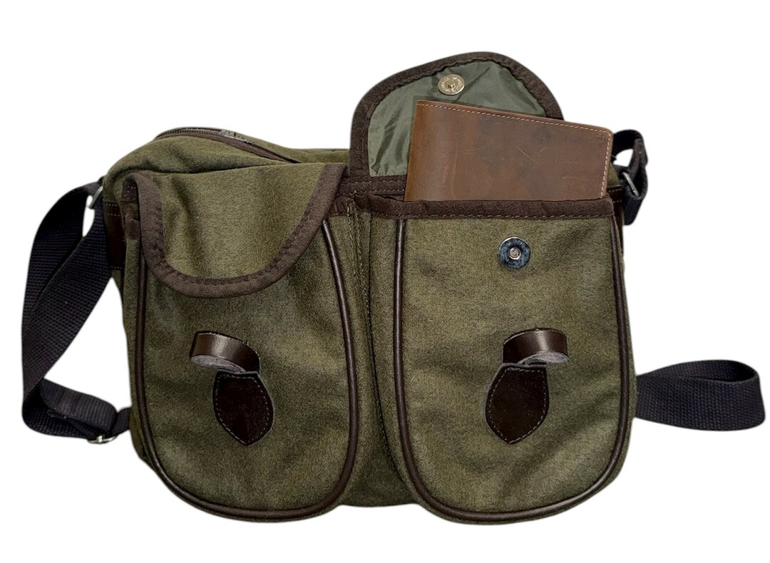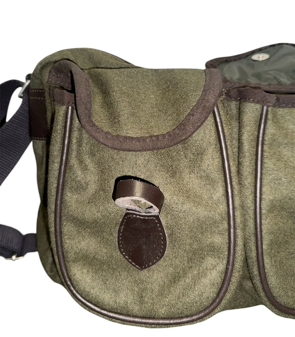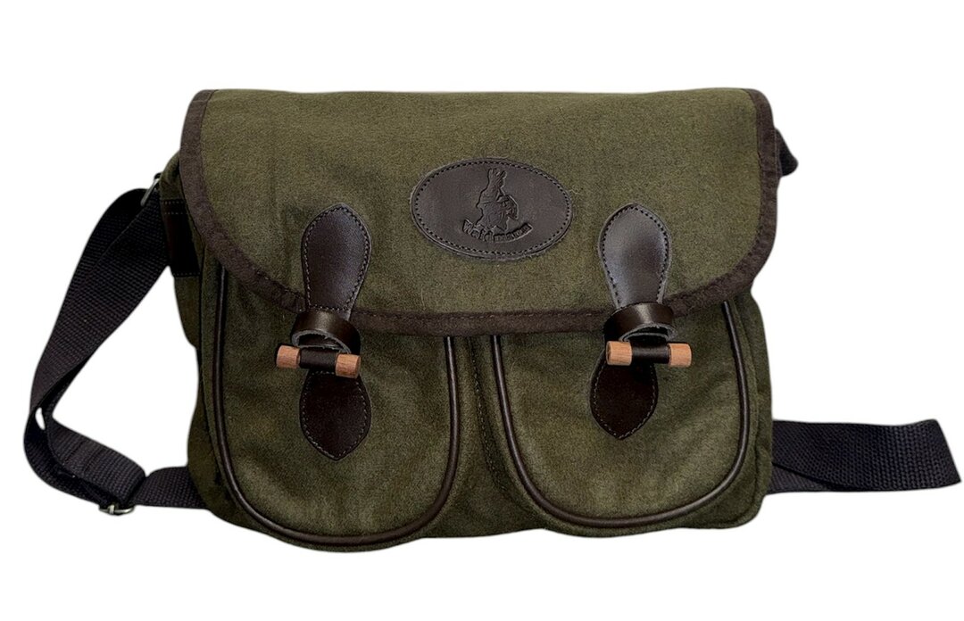 Compacte, waterdichte loden jachttas met afsluitbare ritssluiting, meerdere vakken en verstelbare schouderriem. Ideaal voor het veilig meenemen van patronen en jachtbenodigdheden. Productnummer: 800246-G