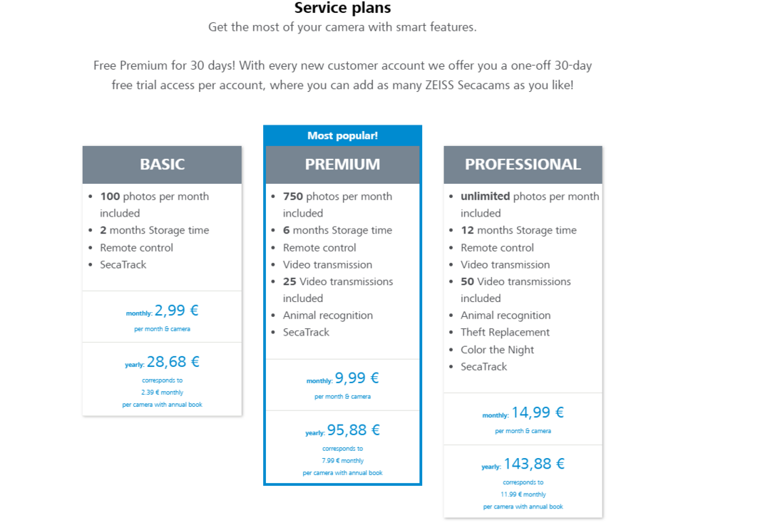 Bij elk nieuw klantaccount ontvang je eenmalig 30 dagen gratis Premium-toegang per account. Tijdens deze periode kun je onbeperkt ZEISS Secacams toevoegen.
