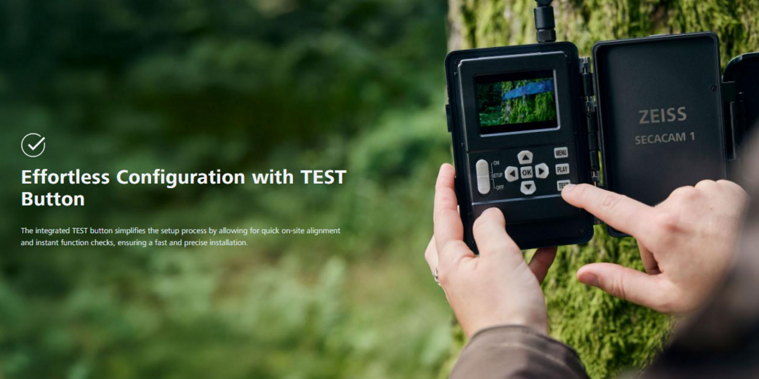 De ZEISS Secacam 1 is de ideale wildcamera voor beginners én een perfecte aanvulling op elke bestaande wildcamera-opstelling. Als essentiële wildcamera combineert hij de bewezen ZEISS-beeldkwaliteit met eenvoudige bediening en volledige compatibiliteit met accessoires. Het 16:9 beeldformaat zorgt voor optimaal bekijken op mobiele toestellen, terwijl het grote 2,4 inch display en de handige TEST-knop zorgen voor een snelle en nauwkeurige installatie in het veld. Dankzij de geïntegreerde LTE-verbinding en het interne geheugen is de ZEISS Secacam 1 direct klaar voor gebruik.