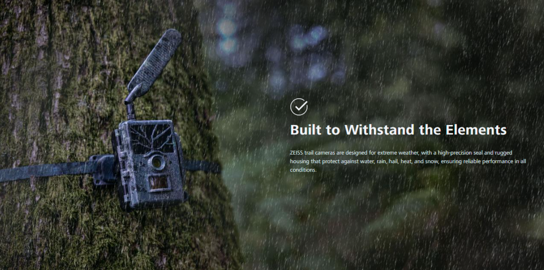 ZEISS wildcamera’s zijn gemaakt voor extreme omstandigheden. Dankzij een nauwkeurige afdichting en robuuste behuizing zijn ze beschermd tegen water, regen, hagel, hitte en sneeuw.