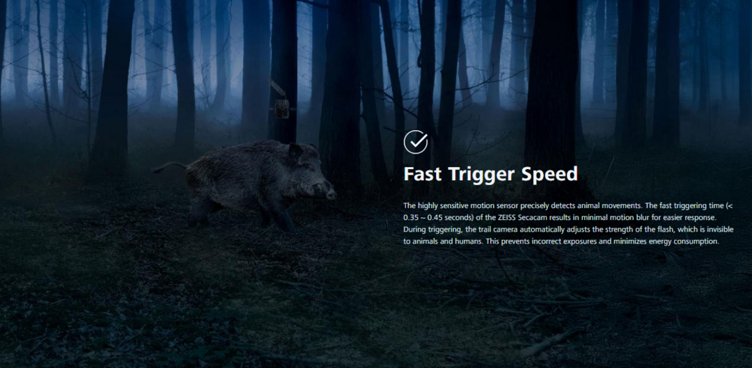 De gevoelige bewegingssensor detecteert dieren zeer nauwkeurig. Met een triggersnelheid van < 0,35 ~ 0,45 seconden krijg je minimale bewegingsonscherpte. De flitssterkte wordt automatisch aangepast voor correcte belichting en lager energieverbruik.