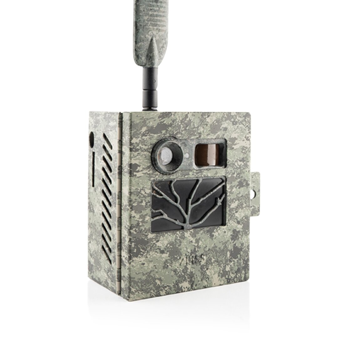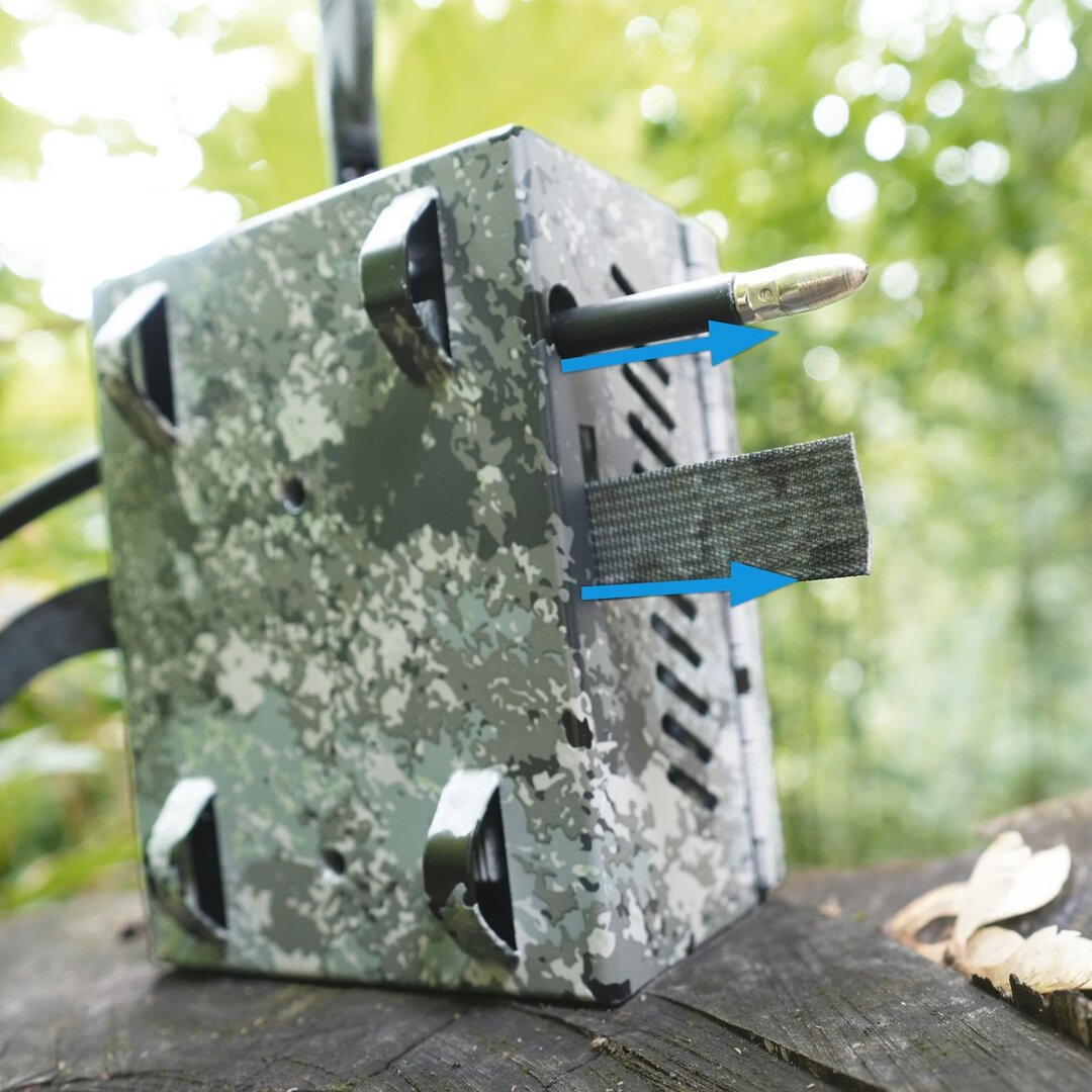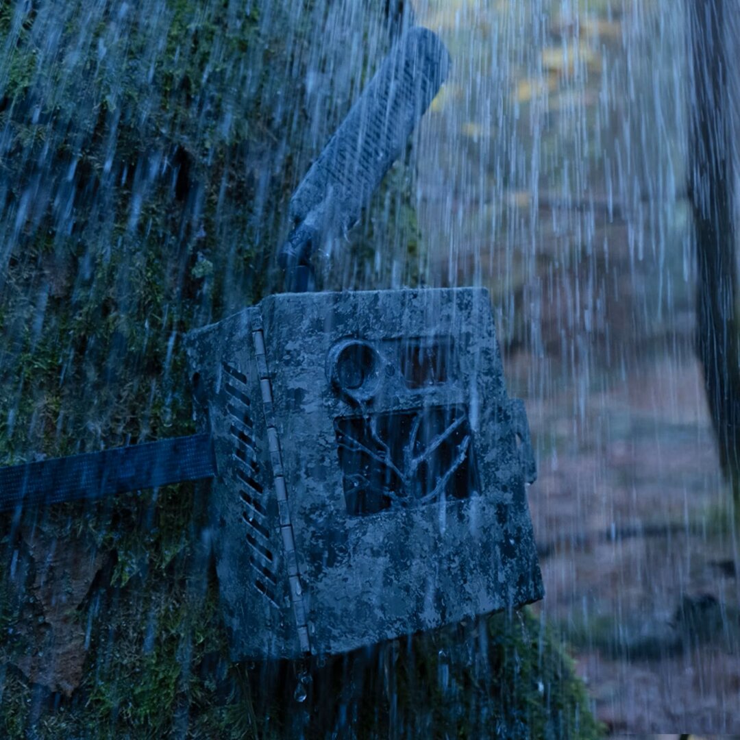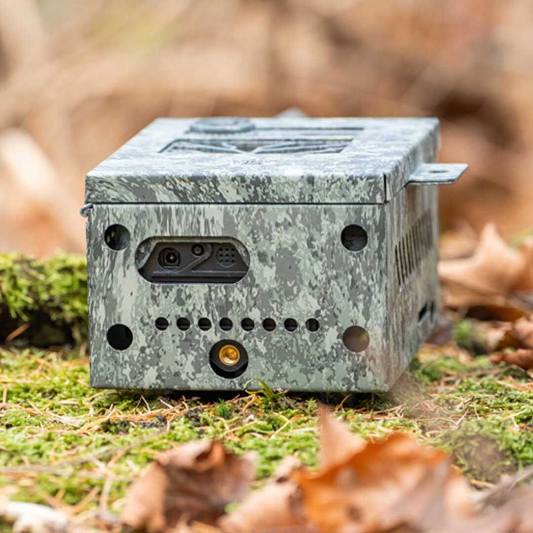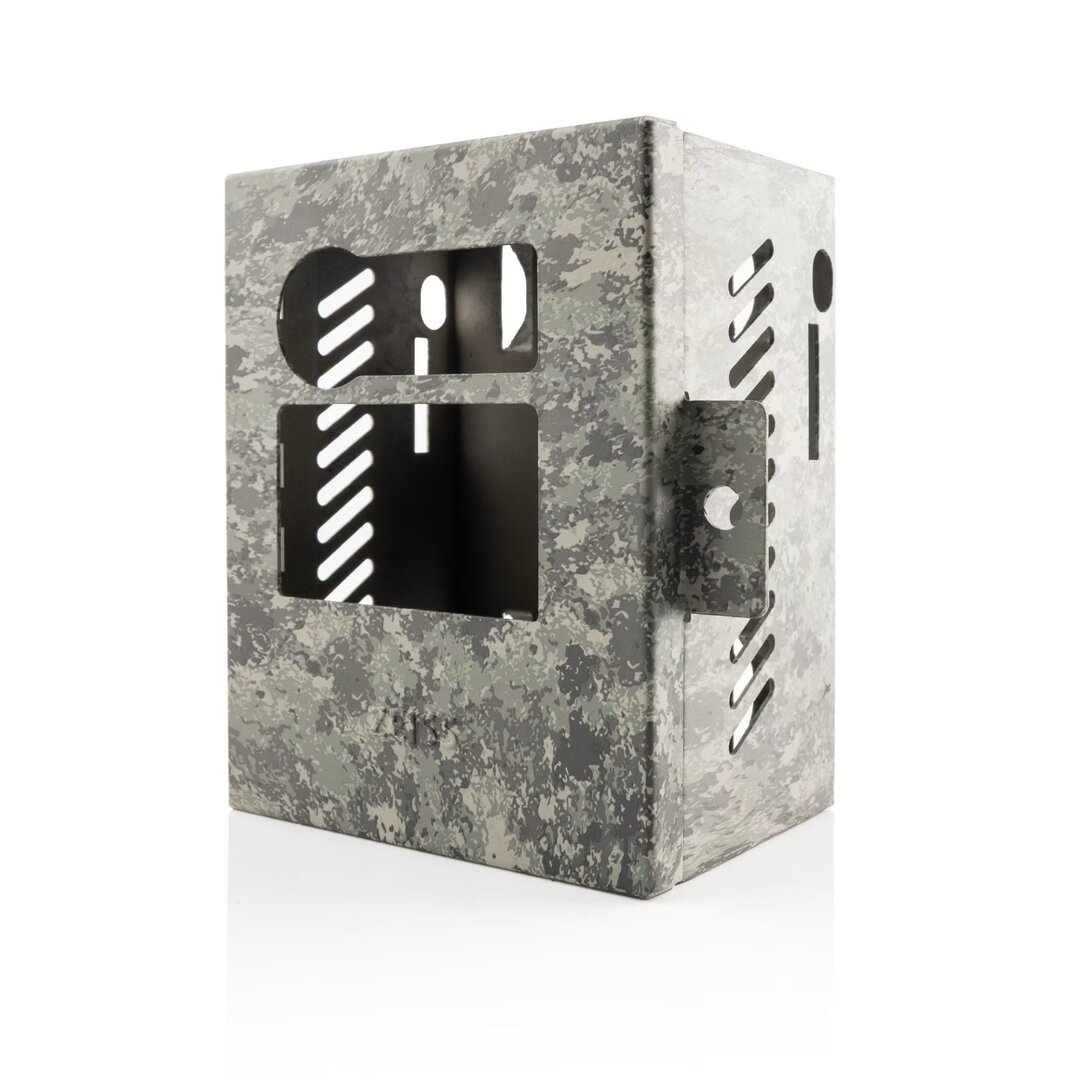 The robust housing encloses the entire camera. Precisely fitting cut-outs on the front ensures that the camera functions are not affected. The full-surface camouflage pattern makes it easier to hide the camera in natural surroundings.